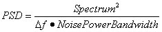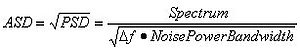 Noise spectra are often displayed in a normalized format called power spectral density (PSD), or amplitude spectral density (ASD). This normalizes the data to the power spectrum (level squared) or amplitude spectrum that would be measured with a bin width of 1.0 Hz using a perfect bandpass filter centered at each point. In addition to compensating for the bin width (Δf), it corrects the spectrum for the scaling of the FFT window used. The spectrum from an AP analyzer can be converted to power spectral density using equation (1).