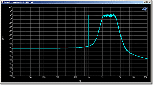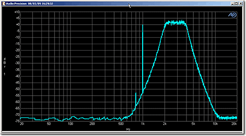 In Figure 2, the same test signal has been measured with a Hann window. In this case, the discrete tone at 1 kHz is still at 0.0 dBr1, but the level of the band-limited noise has increased by about 1.7 dB. This apparent increase in the noise level is due to the scaling applied by the SYS-2722 to correct for the Hann window. As noted, AP analyzers scale FFT results such that the amplitude axis gives the correct reading for tones. If the FFT had been scaled to give the correct reading for noise, then the level of the discrete tone would be -1.7 dBr1 and the band-limited noise would be at 0.0 dBr1.