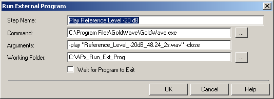 In the example shown in Figure 2, we are using a third party program called Goldwave to play a .wav file containing an audio test stream from the PC’s sound card. Goldwave (available from goldwave.com) is an inexpensive audio editing program that has some useful features. It can be invoked from the command line, and the arguments -play and -close instruct it to play the specified file, then close the application when the file is finished playing. In this case we’ve taken an audio test stream created by the APx Waveform Generation utility and have made a shortened version of the track that’s only 2 seconds long.