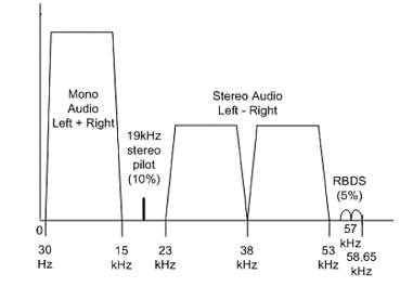 Figure 1 below is a chart that demonstrates the spectral content of a stereo signal multiplexed for FM broadcast. As noted in the references, RDS and RBDS both use a 57 kHz subcarrier to carry a data stream at a bit rate of 1187.5 bits per second.